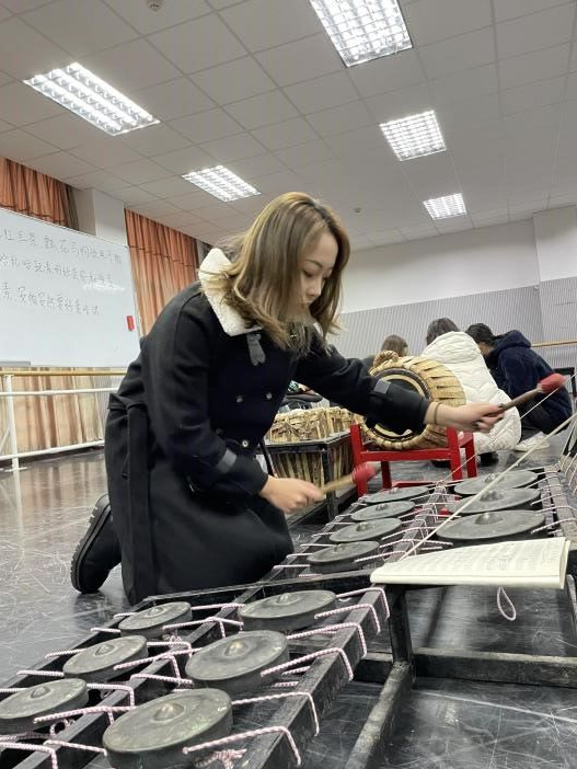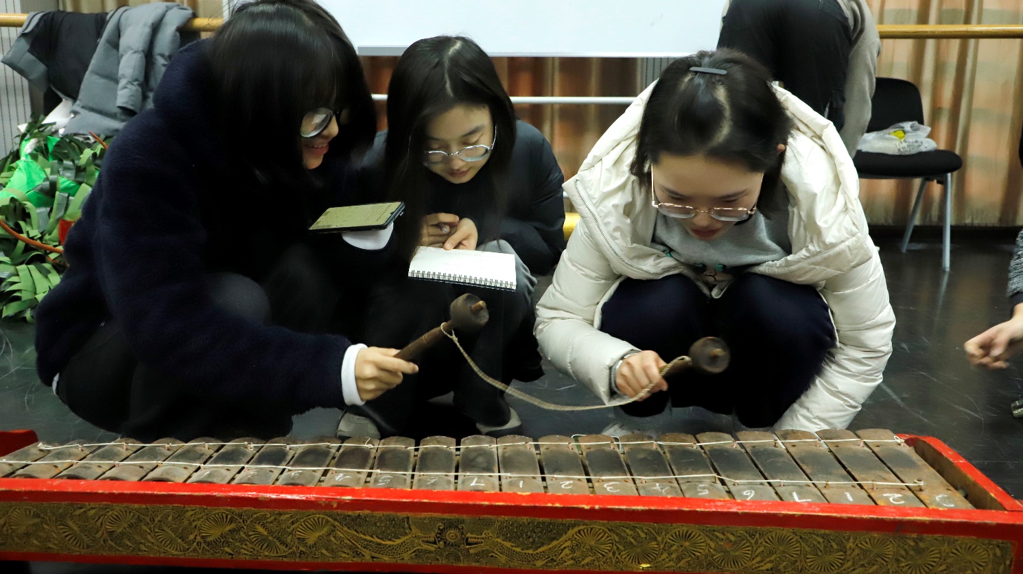 在学习歌曲的同时,负责器乐传承的民间艺人向国乐系的员工进行了傣族传统器乐的讲解与示范。由于艺人们都是口传心授进行教学,对于乐谱的记录与留存具有局限性,所以由员工现场记谱并进行演奏学习。在学习演奏傣族乐器云铓的过程中不难发现,该乐器由两个八度的音构成,演奏时多采用八度交替的形式,在这一特性中,蹦duang(钢片琴)的演奏方式与其类似。