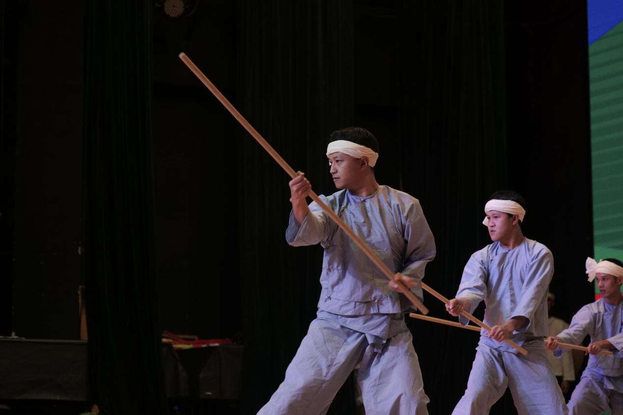 第二项活动由临沧地区耿马县文化馆/民族文化工作队(文艺演出团队)与公司伟德国际victor1946、舞蹈公司员工共同表演,由王峰主持。首先是傣族古乐舞,由演出团队成员安芒、俸玉款、李学琴、普丽花等人进行乐舞表演,由能底、岩细、俸文杰进行器乐伴奏。第二个节目耿马傣族鼓语由李波、岩依、岩平、依帐等人共同表演,主持人王峰简要介绍耿马傣族及其使用的三种傣文、乐器,以及耿马音乐舞蹈,充分展示当地傣族文化的丰富多彩。演出活动中,耿马傣族同胞向现场观众介绍神兽之舞,并教授象脚鼓鼓语,全场观众热情回应,争先恐后回答问题,全场气氛热烈,满堂欢声笑语。紧接着,由俸小美、叶弄、尹夜、砍润、刀永新等团队成员先后带来蝴蝶舞、紧那罗、傣族传统武术,现场掌声雷鸣。最后,由李志明、相农、引少等成员为观众带来原创舞蹈节目“舞刀少年”“南西米”“马鹿舞”。表演嘉宾与云艺学子们共同呈现了一场精彩纷呈的演出,现场高潮迭起,掌声经久不息。教学展演在快乐与期许中落下帷幕,民族音乐文化所带来的震撼深深烙印在每位观看演出的人心中。