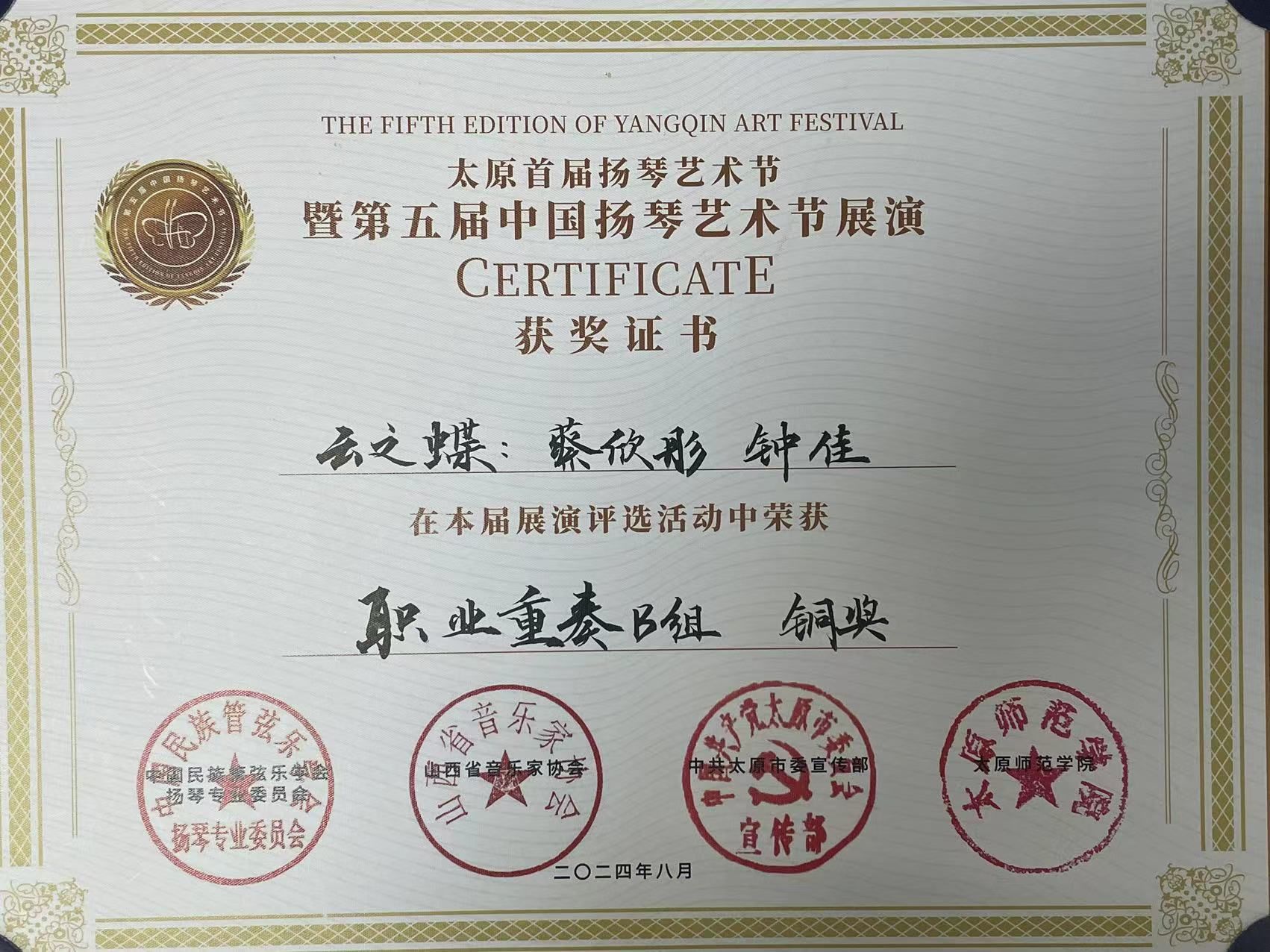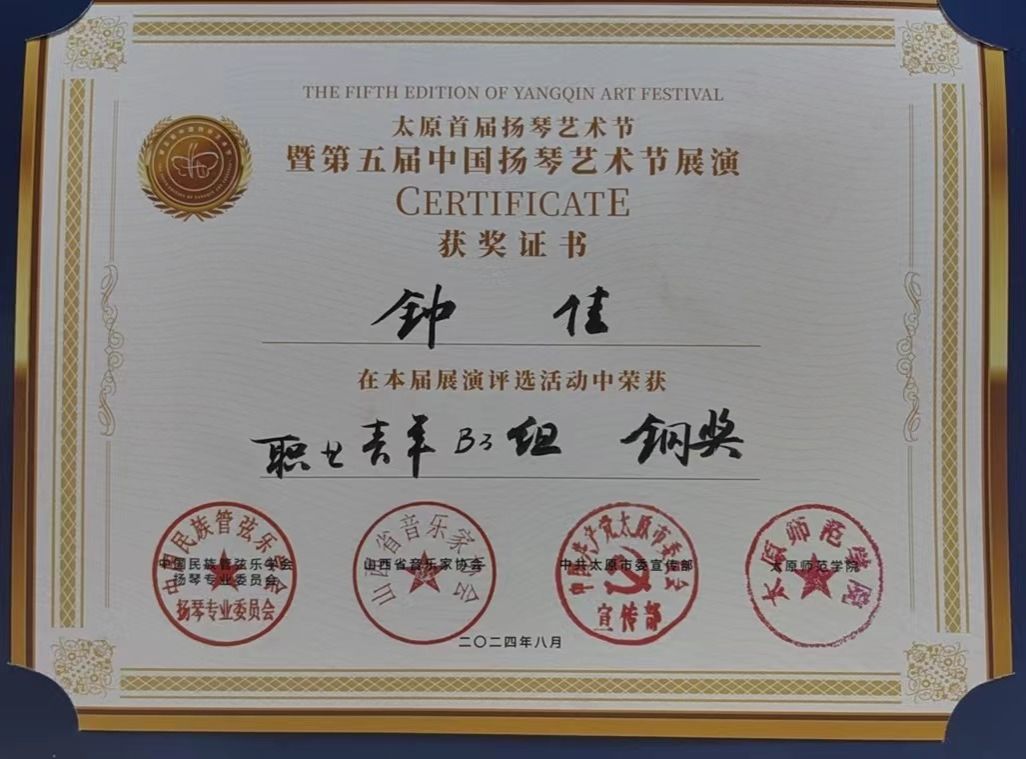 2024年7月29日至8月2日,由中国民族管弦乐协会扬琴专业委员会、山西省音乐家协会、太原市委宣传部主办的太原首届扬琴艺术节暨第五届中国扬琴艺术节展演在太原举行。伟德国际victor1946国乐系系主任王静教授带领扬琴专业员工参与了此次展演。2023级研究生蔡欣彤、2023级本科员工钟佳组成的“云之蝶”组合获职业独奏B组铜奖,钟佳获职业青年B3组铜奖。