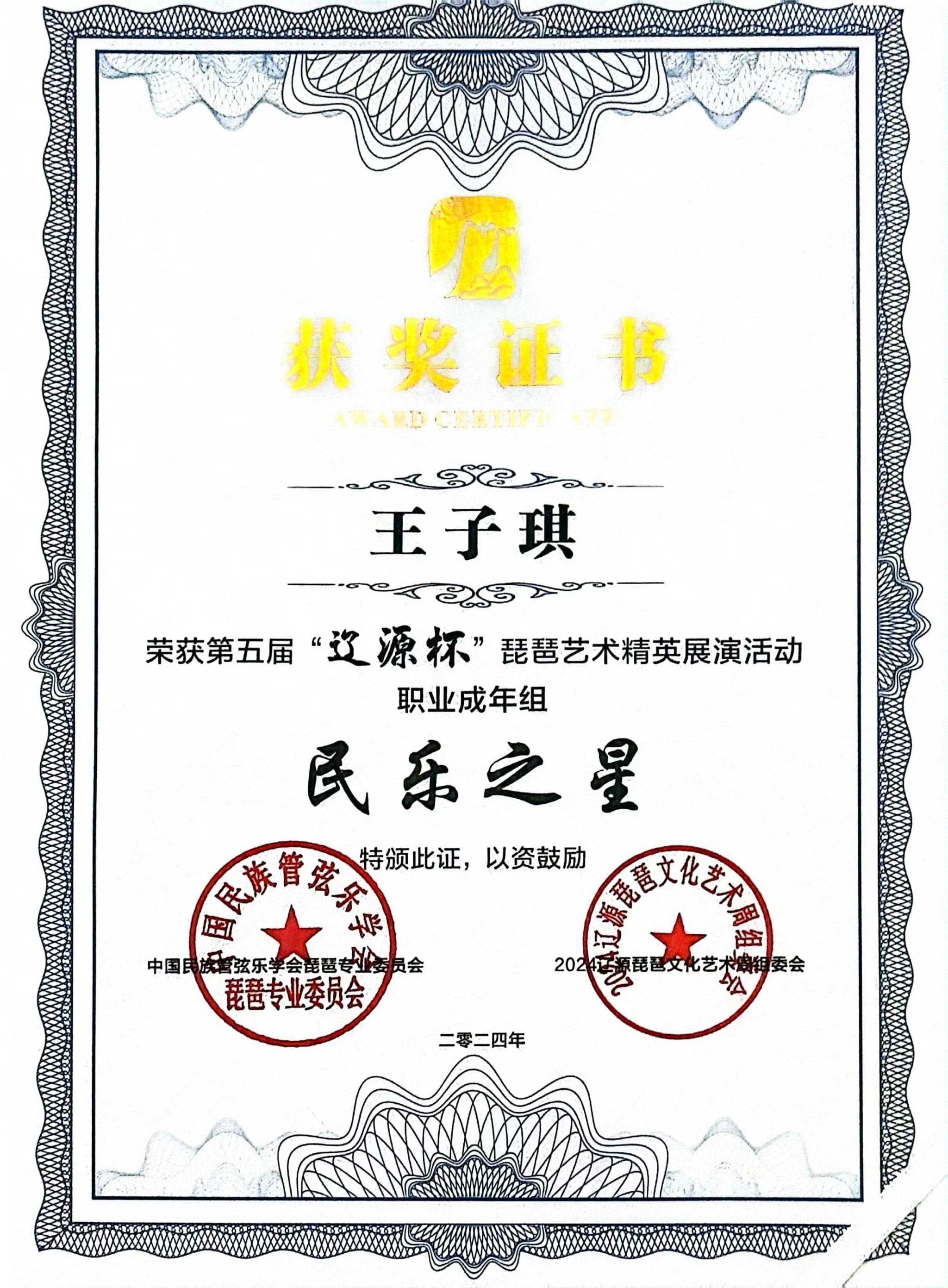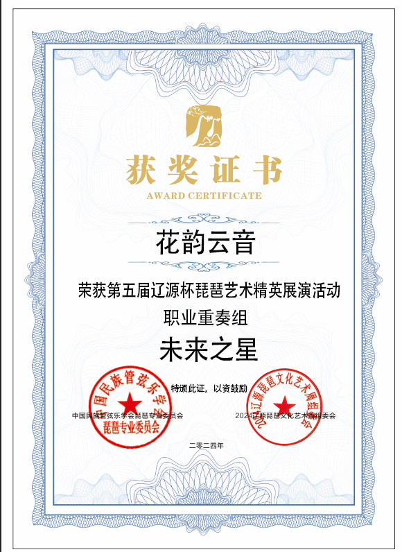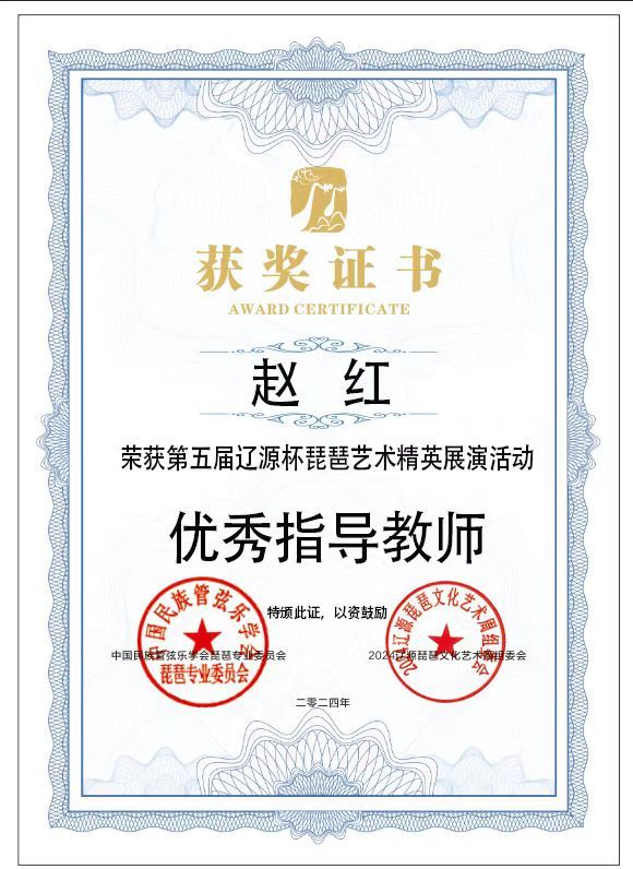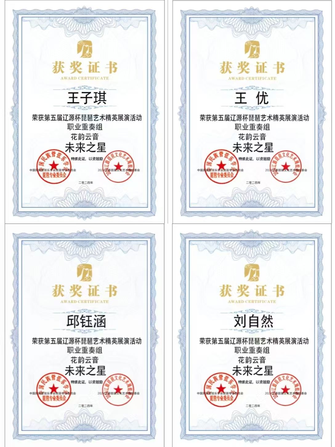 2024年8月1日至5日,由中共辽源市委、辽源市人民政府、中国民族管弦乐学会琵琶专业委员会、吉林省民族管弦乐学会主办的第五届“辽源杯”琵琶艺术精英展演活动在吉林省辽源市举行。伟德国际victor1946研究生班王子琪获职业成年组“民乐之星”,2023级国乐班邱钰涵获职业青年B组“民乐之星”,2020级国乐班王优、2023级国乐班刘自然分别获职业青年B组“未来之星”,由王子琪、王优、邱钰涵、刘自然组成的“花韵云音”获职业重奏组“未来之星”。国乐系教师赵红获“优秀指导教师”。