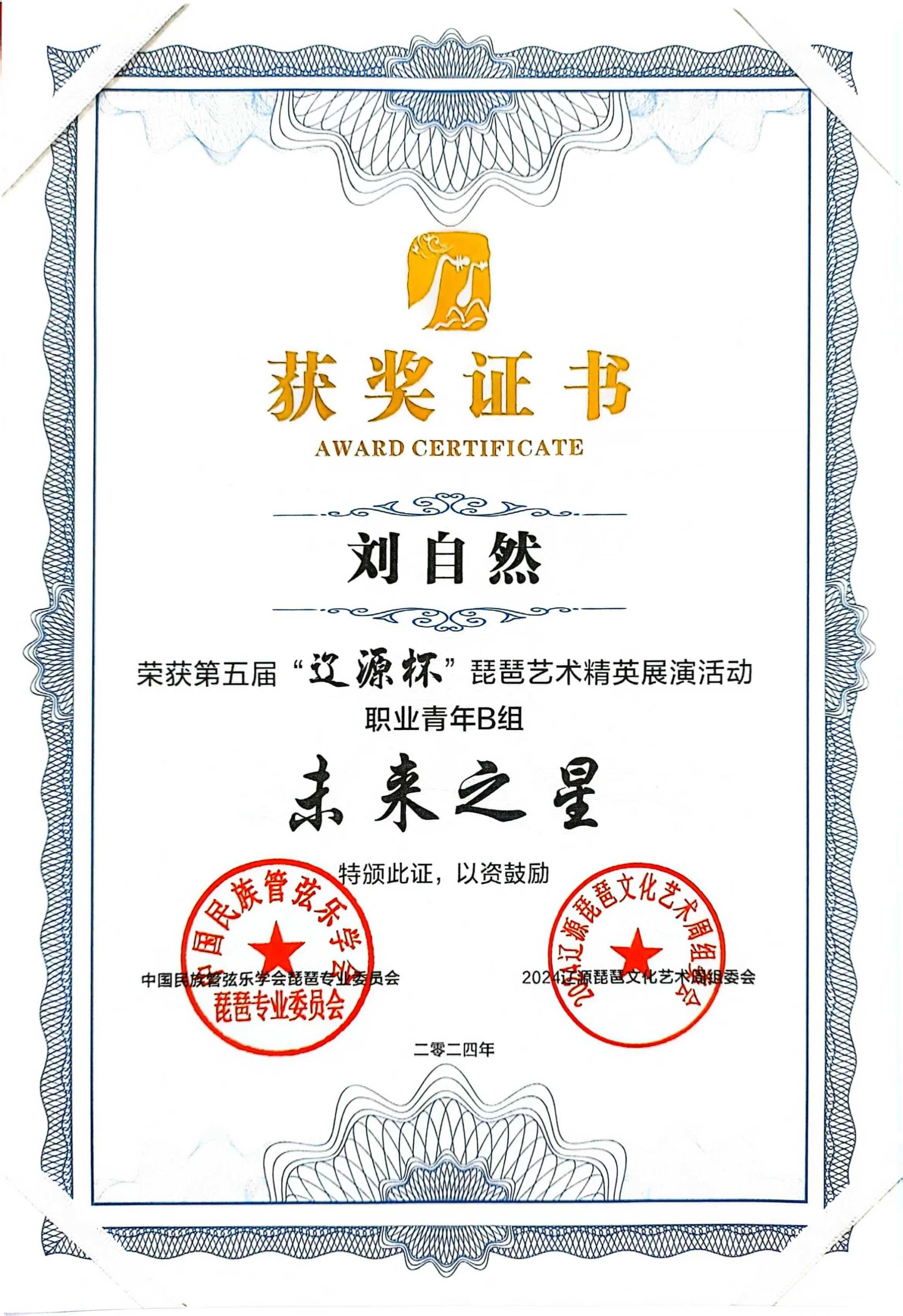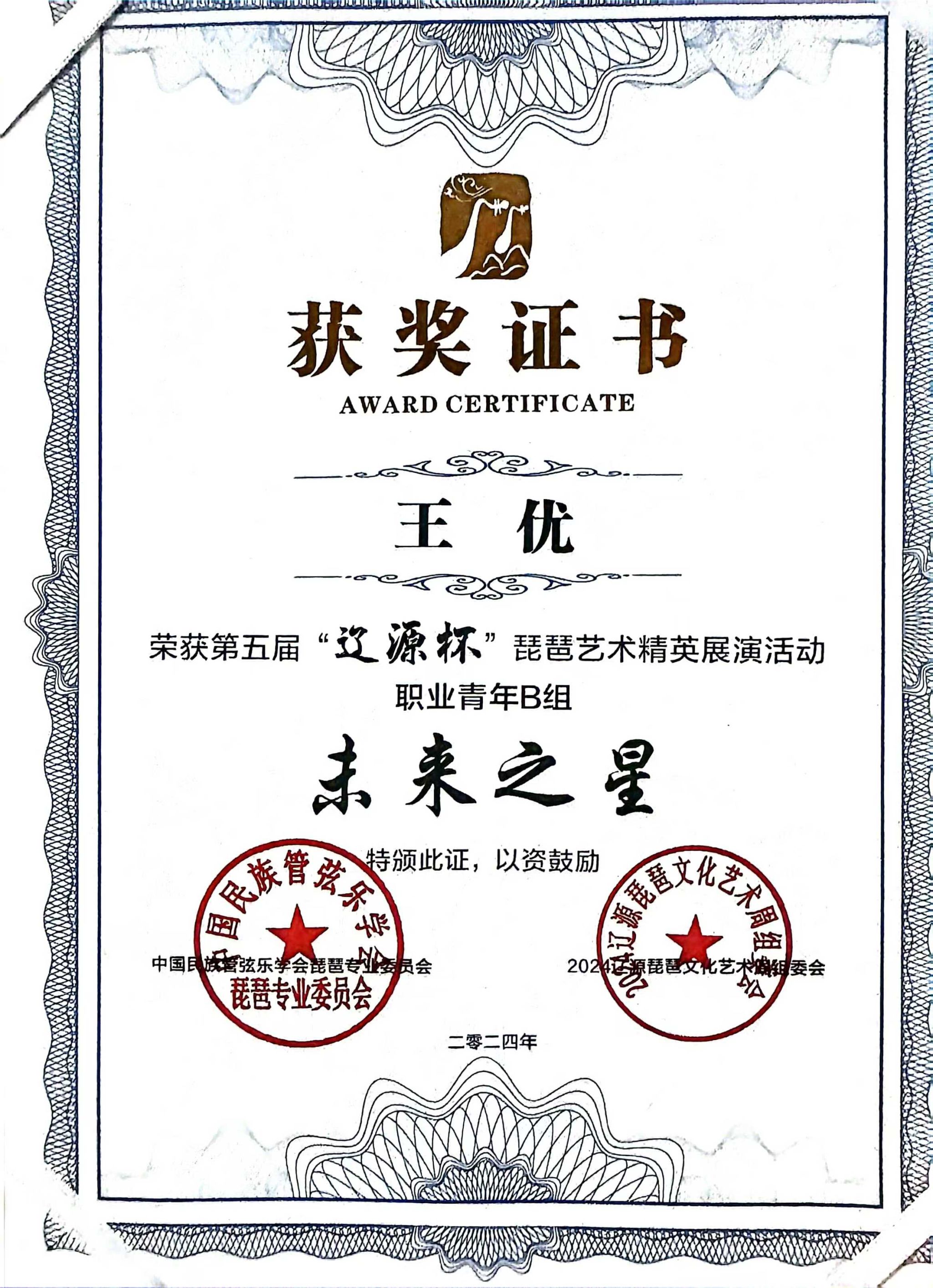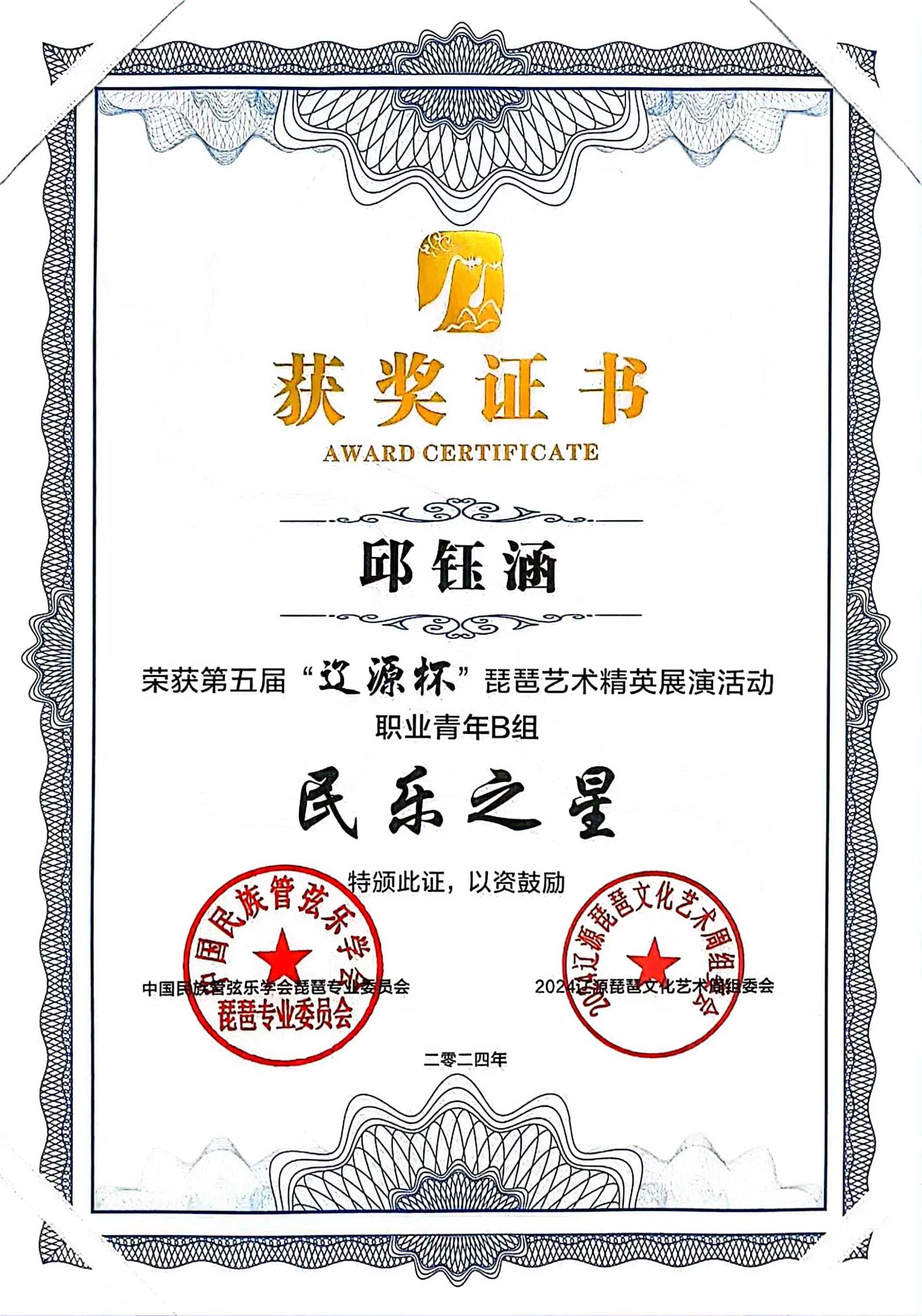 2024年8月1日至5日,由中共辽源市委、辽源市人民政府、中国民族管弦乐学会琵琶专业委员会、吉林省民族管弦乐学会主办的第五届“辽源杯”琵琶艺术精英展演活动在吉林省辽源市举行。伟德国际victor1946研究生班王子琪获职业成年组“民乐之星”,2023级国乐班邱钰涵获职业青年B组“民乐之星”,2020级国乐班王优、2023级国乐班刘自然分别获职业青年B组“未来之星”,由王子琪、王优、邱钰涵、刘自然组成的“花韵云音”获职业重奏组“未来之星”。国乐系教师赵红获“优秀指导教师”。