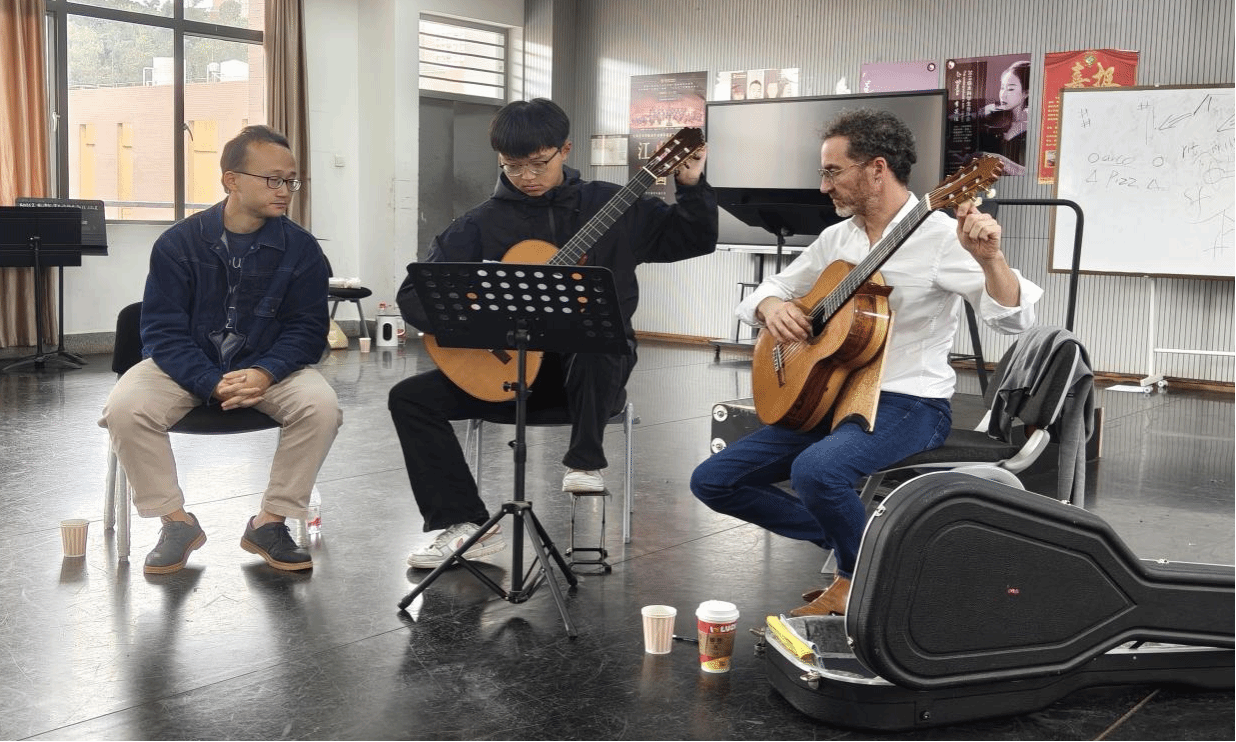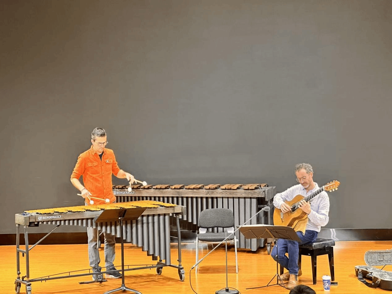 2025年10月8日至9日,经过前期筹备,法国著名古典吉他演奏家雷米·朱赛尔姆(Rémi Jousselme)和打击乐演奏家雷诺·德特(Renaud Detruit)到伟德国际victor1946开展学术交流与讲座。