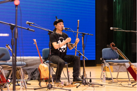 蒙古族音乐的魅力不仅仅在于它有单声部的长短调,还因其具有极具特色的双声部音乐类型。安达组合乐手青格乐老师为我们介绍了一件特色乐器冒顿潮尔,并用它吹奏了曲目《圣山》。浑厚的低音延绵不断,高声部优美的蒙古调旋律,悠扬深邃,久久盘旋于场观众内心深处。
