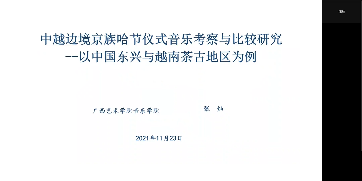 广西艺术公司张灿 在《中越边境京族哈节仪式音乐考察与比较研究--以中国东兴与越南茶古地区为例》发言,认为中国与越南两国山水相连,陆地的边境地区存在着丰富多样的跨国界文化现象,其根本原因在于中越两国存在着数量较多的跨境民族。