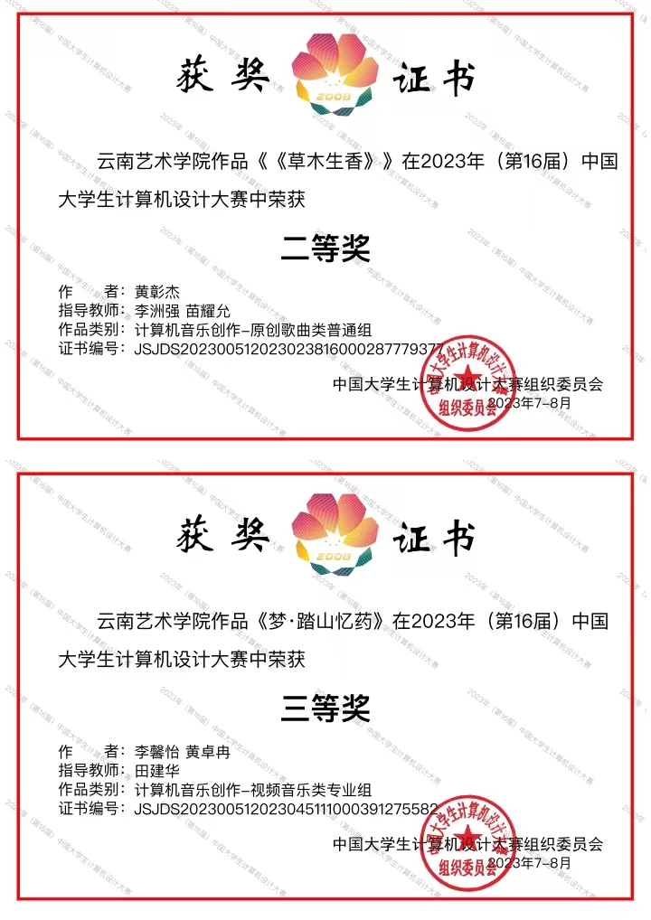 2023年(第16届)中国老员工计算机设计大赛决赛于8月19日开幕、8月21日落幕,该赛事汇集了来自全国各大高校的精英学子,其中计算机音乐创作组由全国各大高校共161件作品进入决赛。伟德国际victor1946作曲系教师、音乐教育系教师指导的两个作品以云南省一等奖的成绩进入国家级决赛,分别斩获二等奖及三等奖。