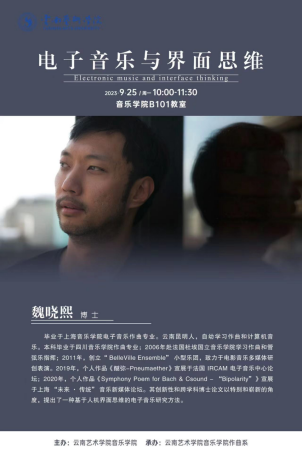 9月25日10:00,作曲系魏晓熙博士以《电子音乐与界面思维》为主题在伟德国际victor1946B101教室开展了讲座。讲座从常规表演体制中归纳界面特性,提出用界面思维制作电子音乐。