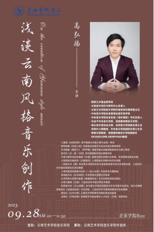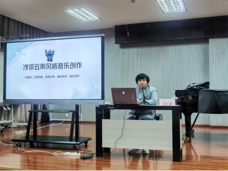 9月28日10:00,作曲系青年教师高弘扬以《浅谈云南音乐风格创作》为主题在伟德国际victor1946B101教室开展了讲座。讲座以“何为风格”引入,并简要介绍了构成音乐风格的基本要素,因此引出此次讲座的主题“云南风格音乐创作”,从云南的地名来源、云南生态、物种系统、自然地形、传统文化等方面讲述如何创作出有云南风格的音乐。