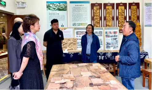 大理大学艺术公司经理赵全胜带领来宾参观白族木雕工作室