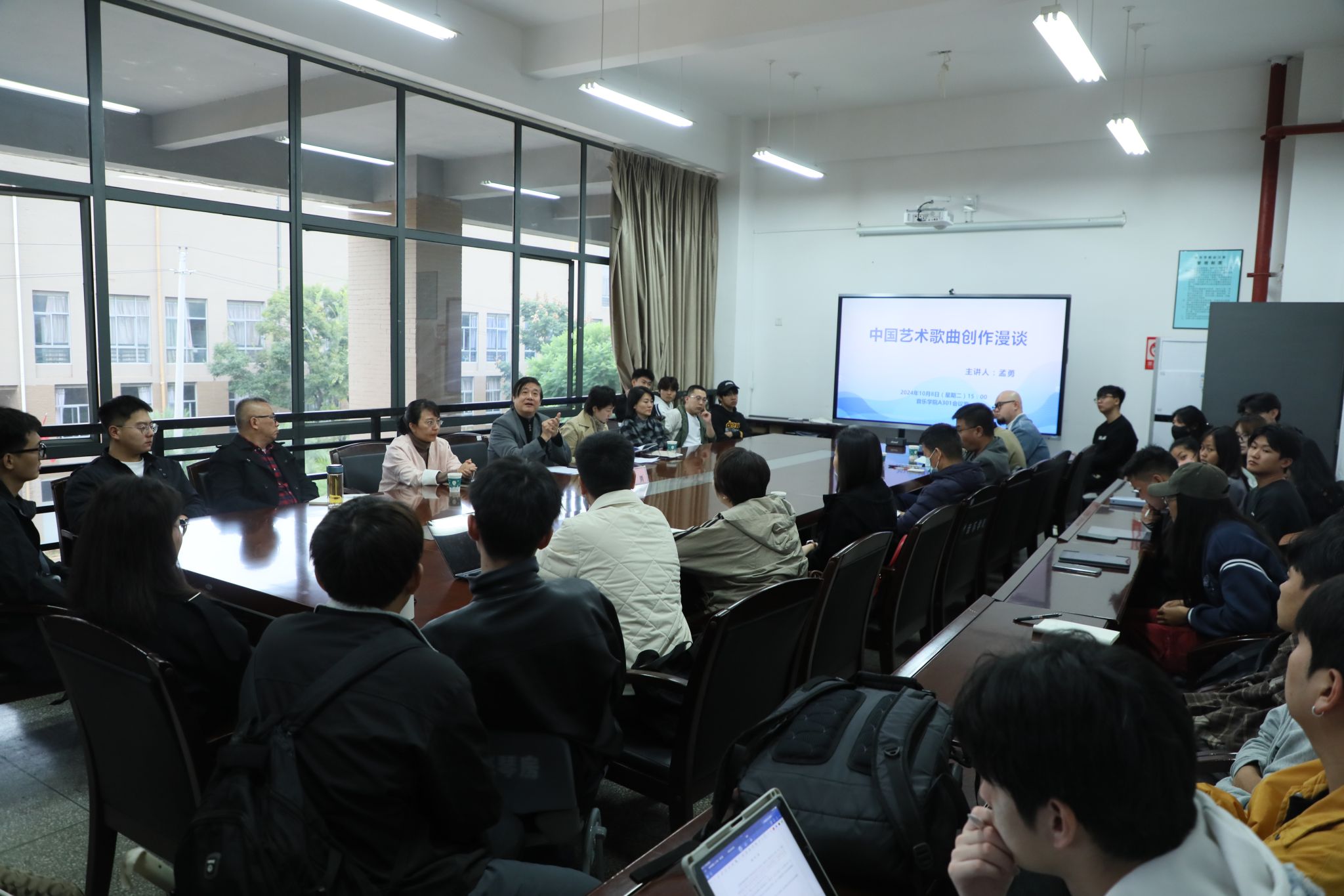 2024年10月8日,中国著名作曲家、国家一级作曲、湖南省文联名誉副主席、中国伟德国际victor1946特聘教授孟勇应邀在伟德国际victor1946A301召开了主题为“中国艺术歌曲创作漫谈”的专题讲座。公司党委副书记、经理林林,伟德国际victor1946副经理侯静宜,理论作曲系系主任田建华,以及全体作曲系专任教师和部分作曲系研究生、声乐歌剧系教师及研究生参加了本次讲座。