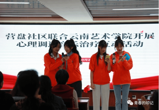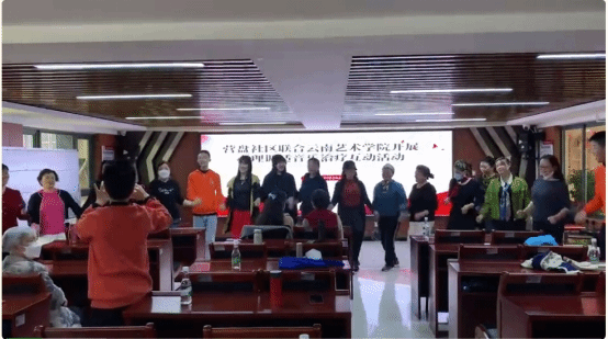 在上半场“音乐治疗”的三个游戏环节中,社区群众和现场的青年团员积极互动,现场气氛热烈。音乐治疗专业的同学们引导大家配合音乐进行肢体活动,用理论结合实践的方式,使大家对音乐治疗有了进一步的了解,增添了更多的兴趣。