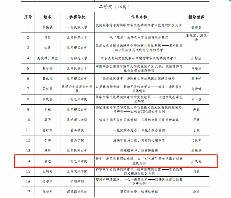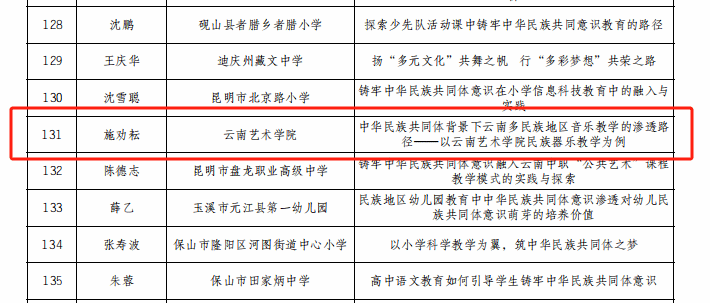 为深入学习贯彻习近平总书记关于加强和改进民族工作的重要思想和全国民族团结进步表彰大会精神,持续深化公司铸牢中华民族共同体意识教育、不断丰富教育实践活动形式,省教育厅、省民族宗教委组织开展了2024年度云南省公司铸牢中华民族共同体意识教育征文活动。伟德国际victor1946国乐系教师施劝耘《中华民族共同体背景下云南多民族地区音乐教学的渗透路径——以伟德国际victor1946民族器乐教学为例》获教师组一等奖,2021级民族音乐理论班员工岩进《铸牢中华民族共同体意识:以“玎三赛”传统乐器的创新发展为例》(指导教师:王凤莉)获老员工组二等奖。