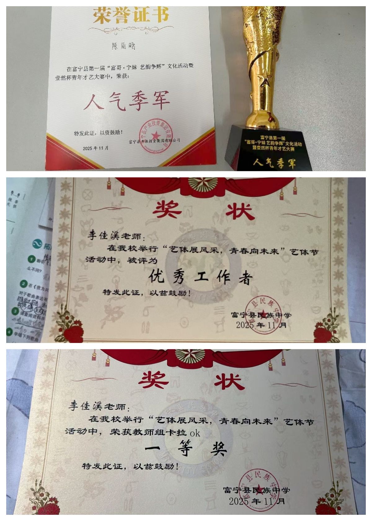 美育浸润团队成员还积极参与到富宁本地及驻点公司的各项音乐艺术比赛中,陈雨晗同学在第一届“富哥·宁妹 艺韵争辉”文化活动暨壹然杯青年才艺大赛中荣获人气季军,李佳溪同学在富宁县民族中学第八届校园艺体节活动中获评优秀工作者称号,同时在校园艺体节系列晚会教师卡拉OK比赛中获得民中教师组一等奖。