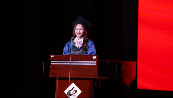 本科生代表林垠君同学分享了大学四年的点滴历程和美好回忆。林垠君表示,走向社会、走入职场,将继续秉持“务实、求新、尚美”的校训,坚持“相互欣赏,彼此成就”的待人原则,坚定志向,勇于拼搏,努力成为勇担民族复兴重任的时代新人。