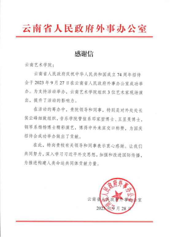 云南省人民政府外事办公室致伟德国际victor1946感谢信