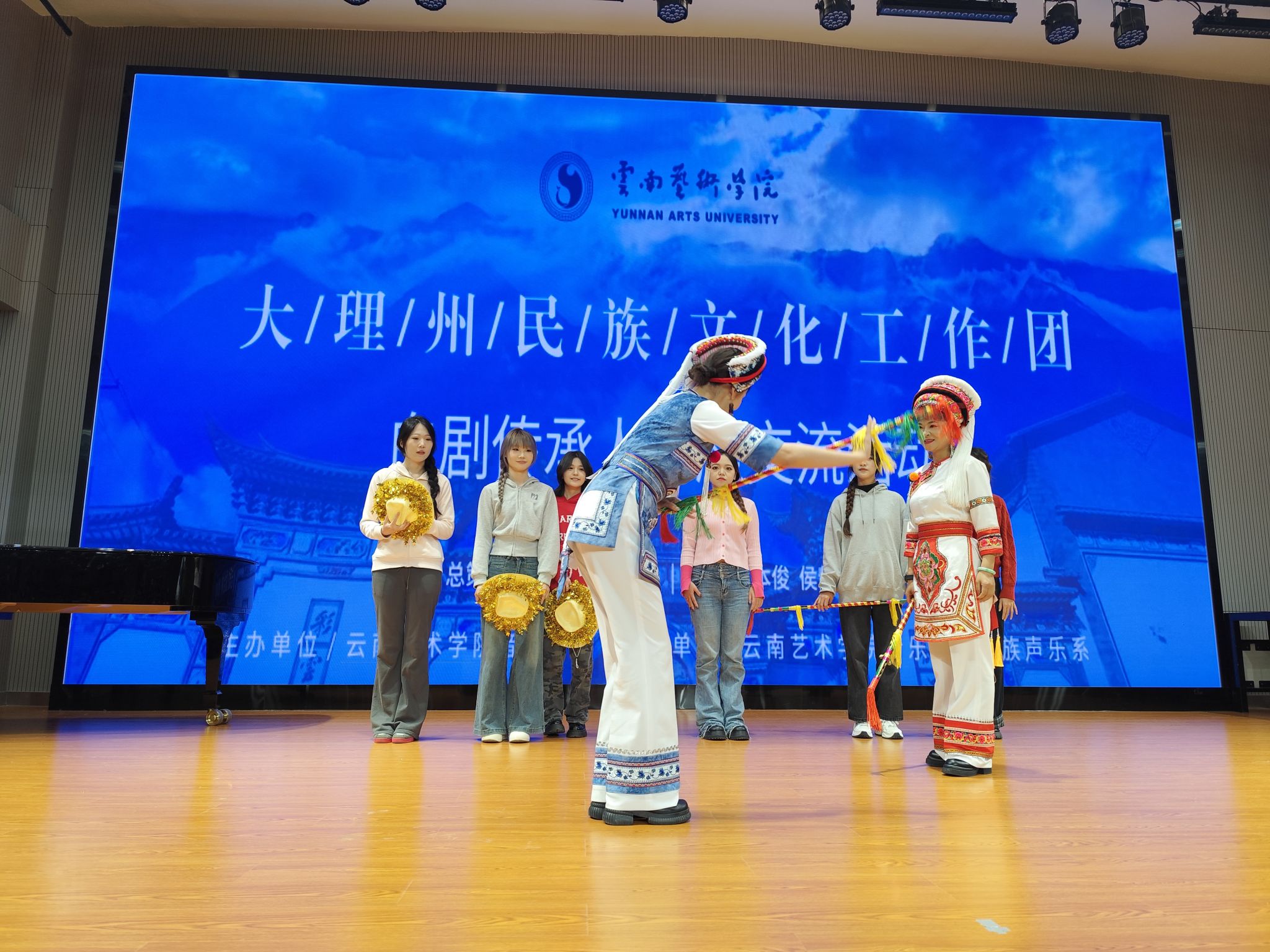 接下来,民族声乐系2022级员工沈于童、毕云菱等六名同学展示了他们在本学期所学的白剧相关内容,赵雪芳老师和董润坪老师对同学们的表演给予了高度评价与认可,并且针对其中一些白族舞蹈动作和唱腔进行了示范教学。